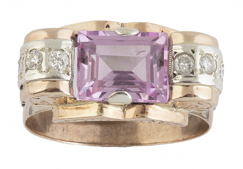Sortija chevalier años 40 con rosa de Francia, entre arcos de diamantes