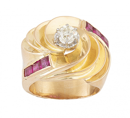 Sortija ancha chevalier años 40 con brillante central de 0,60 ct, entre ondas escalonadas de oro, decorado con rubíes sintéticos talla carré