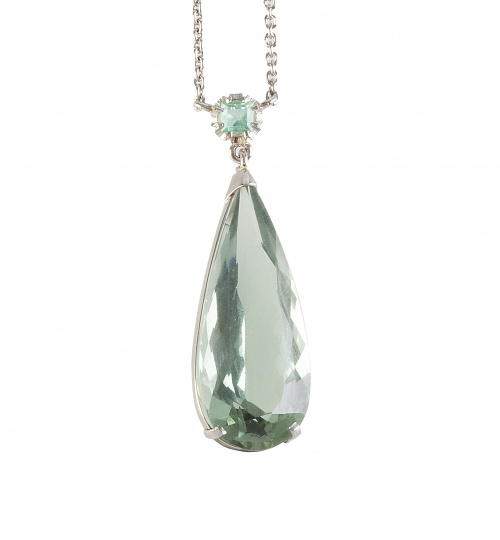 Colgante de platino con esmeralda del que pende perilla facetada de amatista verde