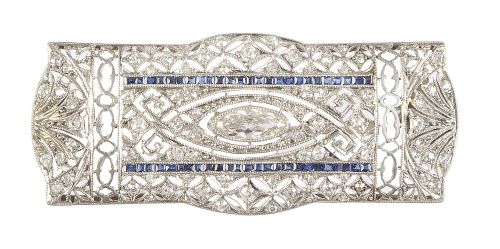 Broche placa Art-Decó con diamante talla marquisse central, en diseño rectangular calado y decorado con diamantes y zafiros calibrados