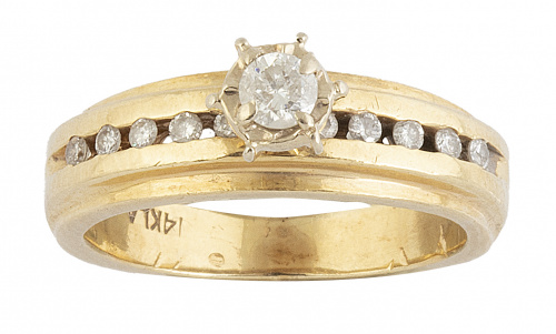 211. Sortija con brillante central elevado, con diez brillantes engastados en carril decorando el aro de la montura