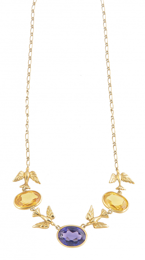 220. Gargantilla de pp. S. XX con amatista y dos citrinos articulados con figuras de golondrinas