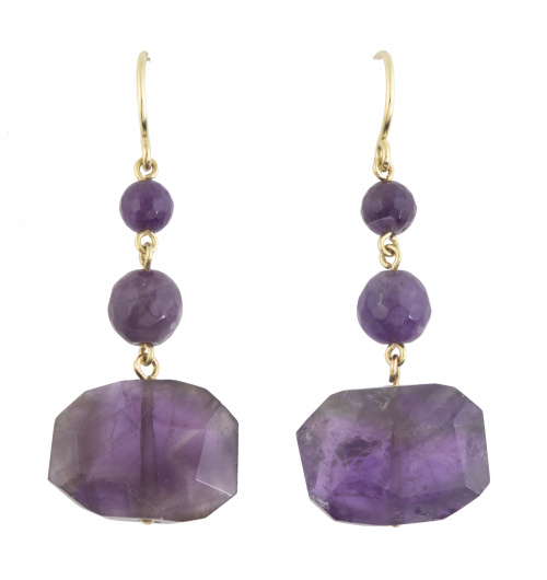 221. Pendientes largos con dos esferas de amatista de la que pende amatista de talla geométrica