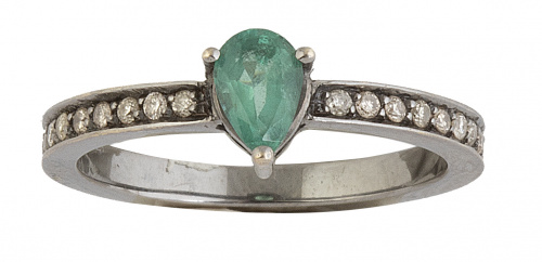 Sortija con esmeralda talla perilla y brillantes en los brazos de la montura