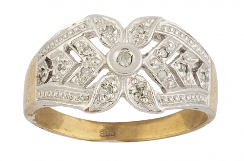 246. Sortija de frente ancho con flor central con chaton en el centro y decoración calada