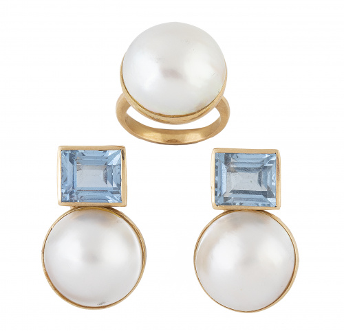 249. Conjunto de pendientes de perla mabe con aguamarina sintética de talla esmeralda, y sortija de perla mabe