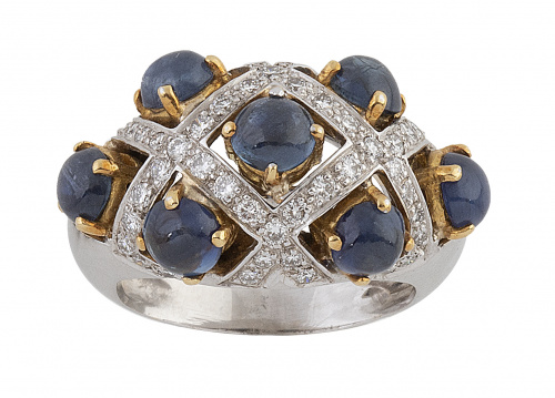 258. Sortija de zafiros y brillantes con diseño de retícula de brillantes en cuyos rombos hay cabuchones de zafiros