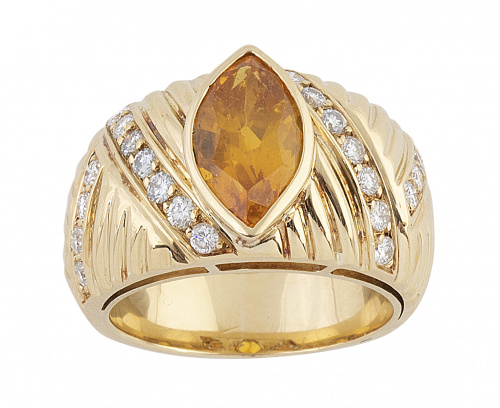 Sortija con zafiro amarillo central talla navette en montura ancha gallonada y decorada con líneas de brillantes