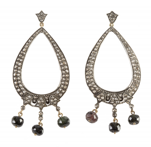 282. Pendientes largos con diseño de gota calada, con diamantes de talla rosa y esferas facetadas de granates colgantes