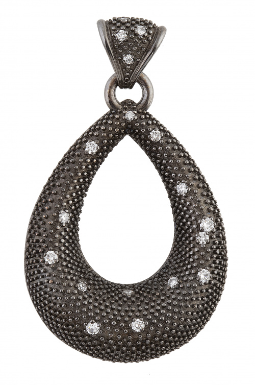 285. Colgante en forma de lágrima calada de perfil curvo, pavonado y decorado con brillantes y pequeños puntos en relieve