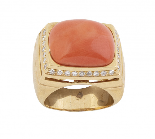 305. Sortija ancha con gran cabuchón cuadrangular de coral, rodeado por marco cuadrado de brillantes
