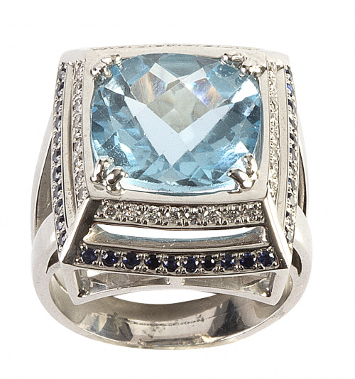 Sortija con topacio azulcuadrangular en talla fantasía rodeado de un marco de brillantes y otro de zafiros