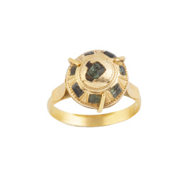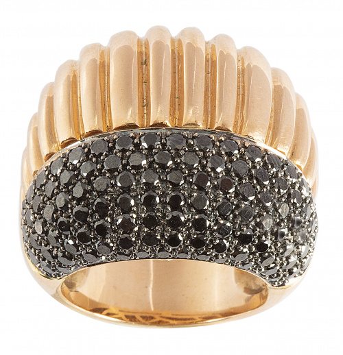 Gran sortija con diseño asimétrico con pavé de brillantes negros y banda gallonada de oro rosa