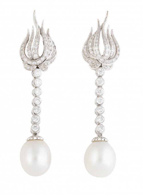 369. Pendientes largos de brillantes con perlas australianas ovoides colgantes