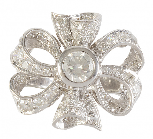 378. Sortija flor con lazo de de cintas entrelazadas de brillantes y brillante central en chatón de 0,50 ct aprox