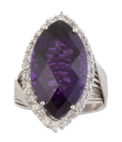 380. Sortija con gran amatista talla navette fantasía orlada de brillantes
