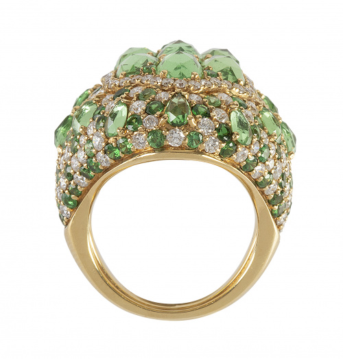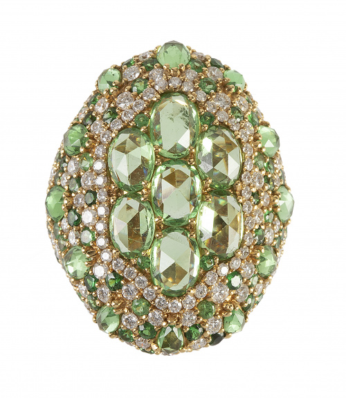 382. Sortija lanzadera de tsavoritas de talla oval fantasía y brillantes en diseño de gran óvalo bombée