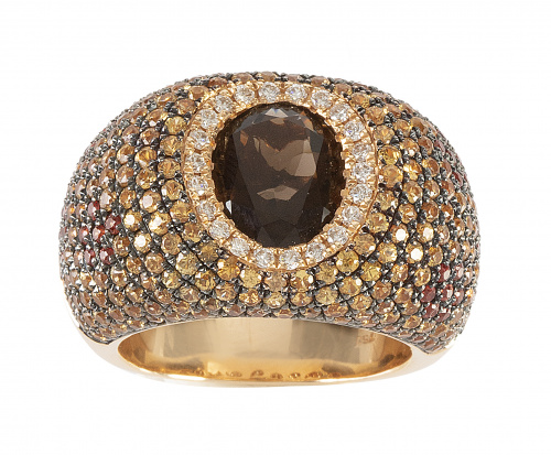 Sortija ancha con pavé de citrinos amarillos y rojos, y centro de citrino fumée orlado de brillantes, en diseño a modo de turbante