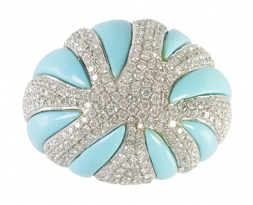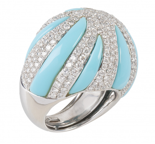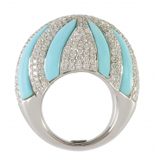 399. Gran sortija bombée de turquesas y bandas de pavé de brillantes en bandas alteranas de diseño orgánico