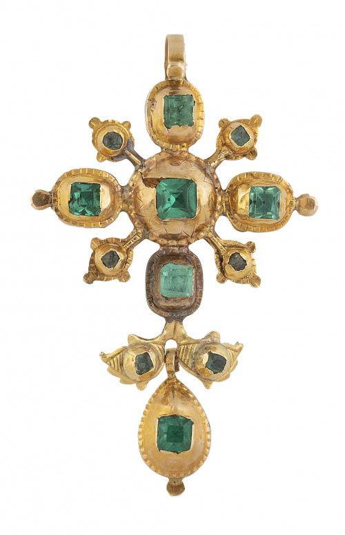 Cruz colgante popular S. XIX de esmeraldas y símil esmeraldas con botón colgante en forma de pera que pende de doble hoja
