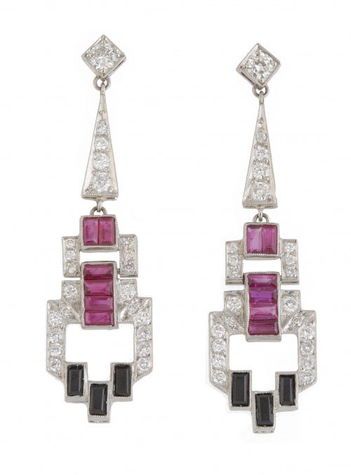 402. Pendientes largos estilo Art-Decó de piezas geométricas caladas, con brillantes rubíes y ónix talla baguette