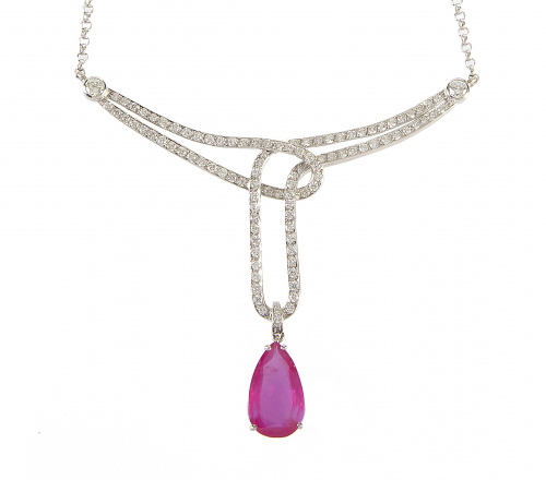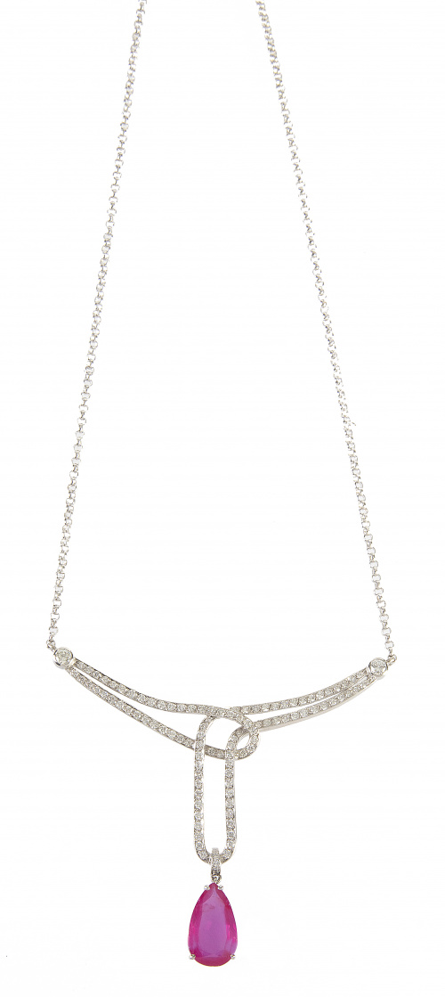 405. Pendentif con centro de perilla de rubí, colgante de lazada de brillantes que se une a la cadena con dos brillantes en chatón