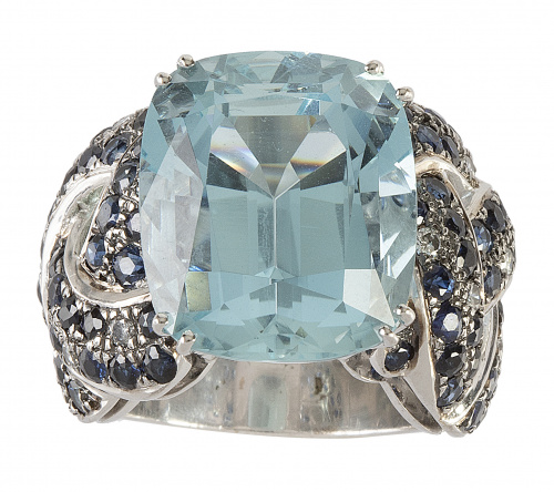 Sortija con gran aguamarina central de intenso color en talla cojín, con montura de bandas trenzadas de zafiros adornadas con brillantes
