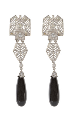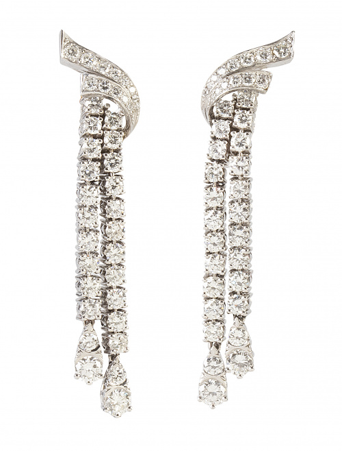 413. Pendientes largos de brillantes años 50, con dos líneas de brillantes en rivière que penden de dos bandas oblícuas