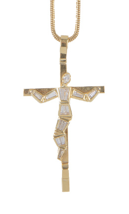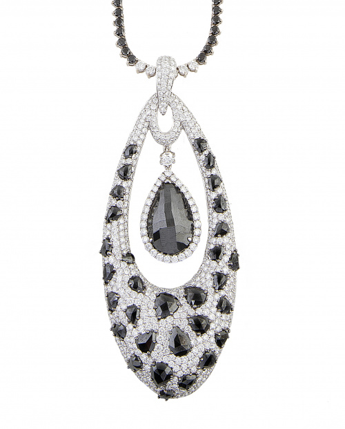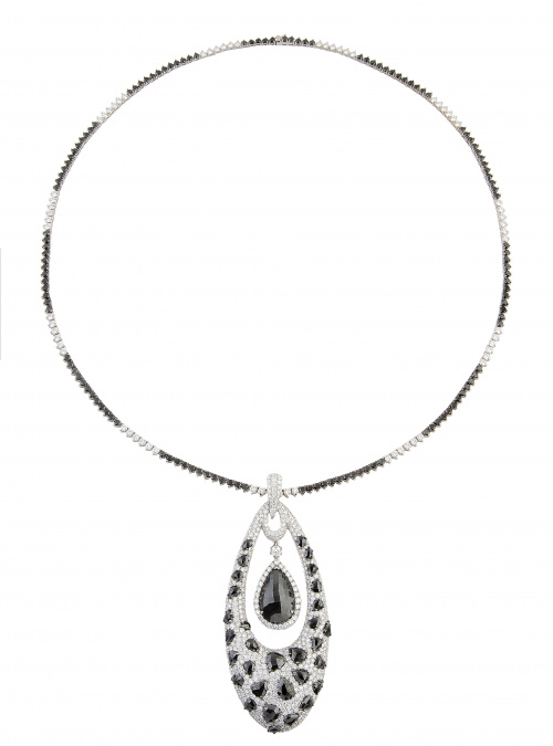 El colgante en forma de gran gota calada en el centro, está decorado con diamantes negros facetados en diseño a modo de animal print, engastados sobre el pavé de brillantes incoloros.