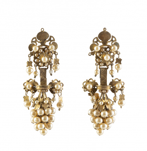 46. Pendientes largos populares valencianos de pp. S. XX con grandes racimos de perlas de vidrio y motivos de hojas