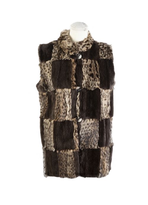 Chaleco vintage de piel de nutria y gato montés combinados en damero con bolsillos laterales y cierre de botones