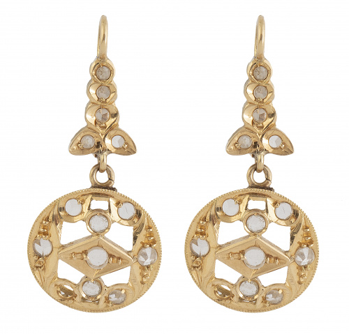 50. Pendientes largos de pp. S. XX con círculos colgantes que penden de hojita, decorados con zafiros blancos