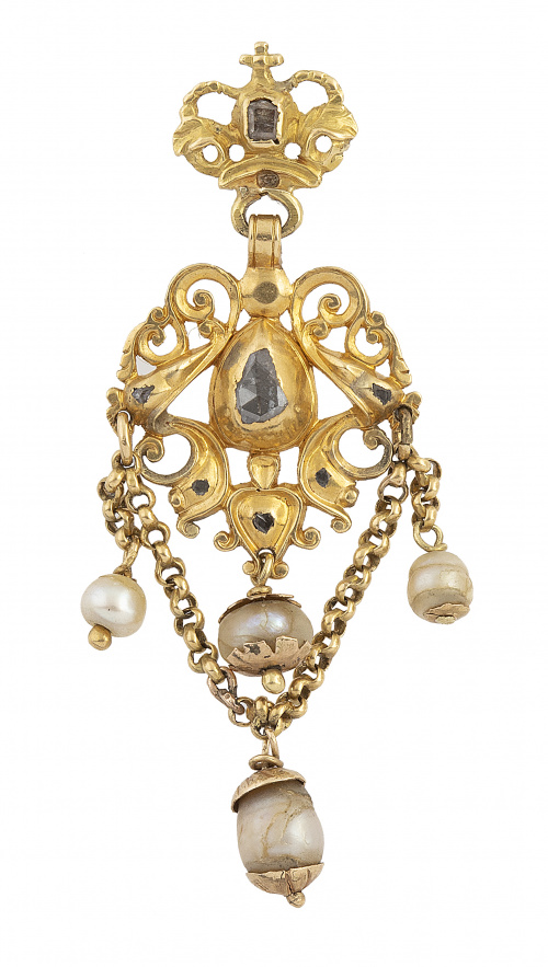 6. Colgante S. XVIII con corona y centro colgante de formas vegetales con diamantes de talla rosa y perlas finas colgantes