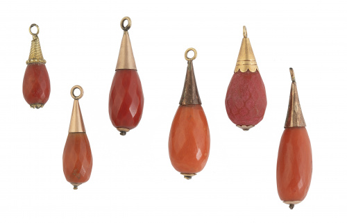 Lote de seis dijes de perillas facetadas de coral de pp. S. XX