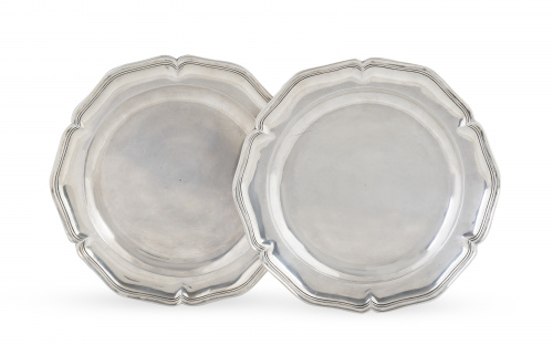 Pareja de platos de plata con contorno ingletado. Con marcas.