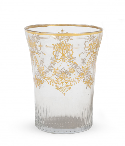 Home / SUBASTA MARZO 2023 / Vaso Carlos IV de vidrio soplado a molde, decoración dorada
