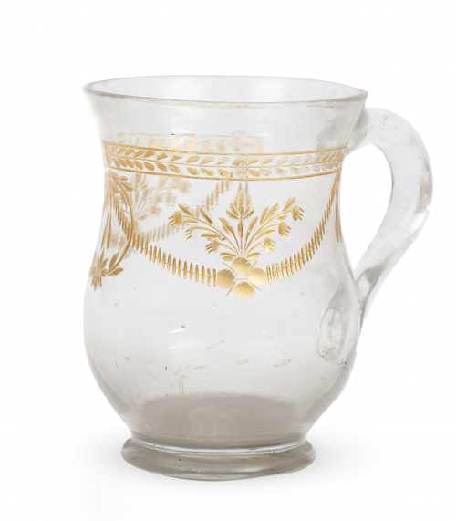 1113. Jarra con asa Carlos IV, de vidrio incoloro soplado a molde, decoración grabada a rueda y dorada, con guirnaldas esquemáticas.