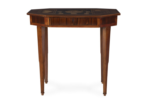 De forma octogonal, sobre patas rectas, albergando cajón central.