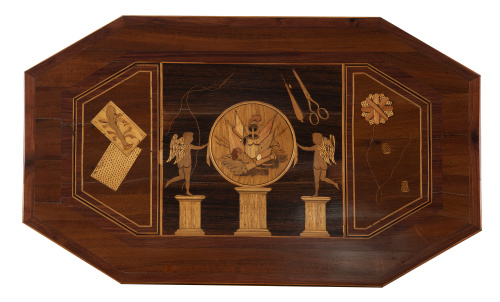 Marquetería tipo “trompe-l'œil” en la tapa mostrando medallón con trofeo militar, puttis sobre columnas clásicas, naipes y utensilios de costura.