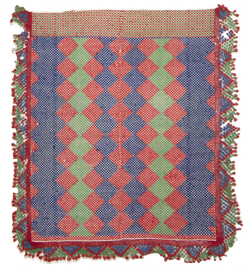 1137. Colcha de las Alpujarras en lana roja, azul y verde, con decoración de rombos.
