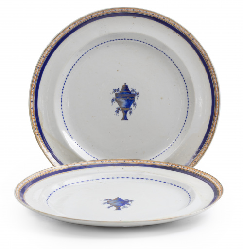 Pareja de platos de porcelana esmaltada de Compañía de Indias con jarrón azul en el asiento.