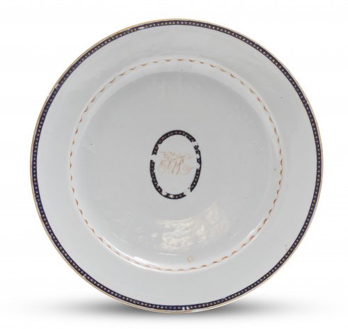 1181. Plato de porcelana esmaltada de Compañía de Indias con filo azul y estrellas doradas y medallón en el centro con iniciales.