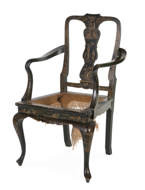 1183. Silla de estilo reina Ana de madera lacada de verde y dorada con chinerías.
