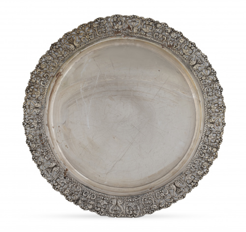 Bandeja circular de plata, con borde calado con flores y hojas.