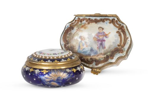 Lote de dos cajitas: una circular de metal dorado y esmalte con decoración floral y estrellas, otra de porcelana y bronce dorado con escena galante en la tapa.