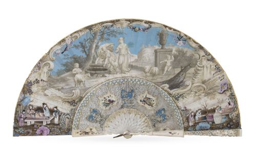 Abanico con varillaje de marfil policromado y paisaje de papel pintado y dorado con grisalla con escena narrativa, en el reverso escenas orientales.