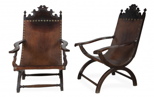 1311. Pareja de sillas de brazos de piel tachonada y madera tallada.