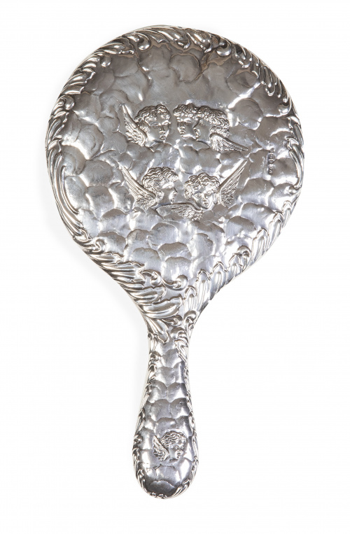 Espejo de tocador eduardino de plata, decorado con querubines. Con marcas.