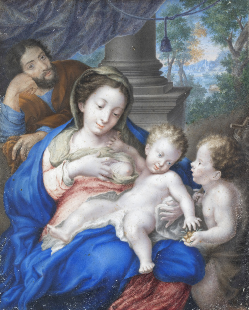 La obra que presentamos, firmada y fechada en 1721, es una interesante aportacion al corpus pictórico del pintor y una muestra de su habilidad técnica como miniaturista. Sobre un fondo de paisaje resuelto con un cuidadoso detalle, la Sagrada Familia con San Juanito. Destacamos finisimo moldeado de las figuras y el maravalliso juego cromático, armónico y equilibrado de tonos rosados en las carnaciones, morado en el cortinaje del fondo, suaves verdes, azules y amarillos en el paisaje y el maravilloso pigmento azul utilizado en el manto de la Virgen.