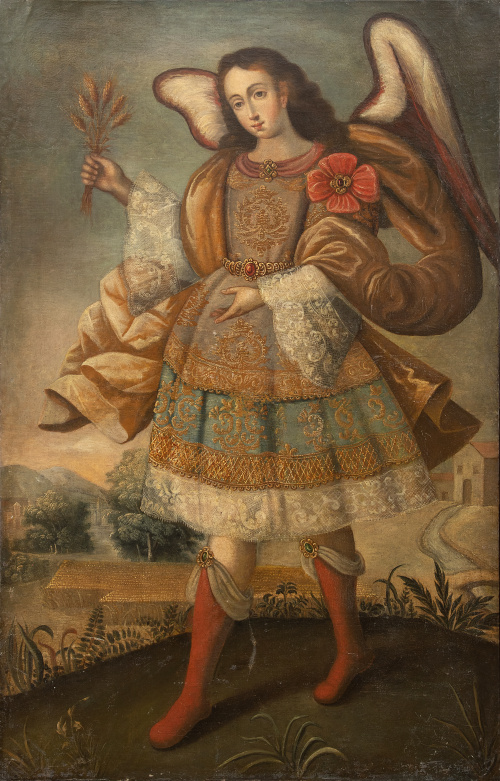 La pintura de ángeles en la pintura virreinal del Sur Andino, Bolivia y Perú alcanza una de las expresiones más atractivas en el arte de todos los tiempos como ya sugirió el académico peruano Francisco Stastny, “la abundancia de pinturas de ángeles en Bolivia y Perú coloniales podría deberse a su atractivo para la pintura de indígenas”. Las figuras pioneras de los ángeles llegaron a Sudamérica con los primeros misioneros, sobre todo los jesuitas, que difundieron la devoción angelical como parte de la evangelización y cristianización. Eran considerados, mensajeros de Dios, criaturas de amor y misericordia, cuya misión era proteger a cada hombre en el camino arduo y peligroso de la vida. La religiosidad andina, las relacionaron con sus dioses, con sus aves sagradas y las plumas usadas como símbolo de poder y realeza.